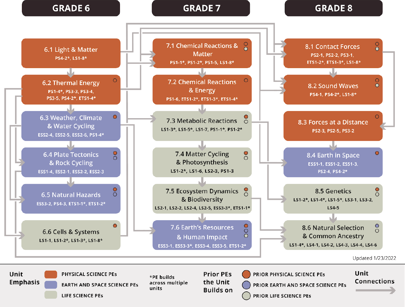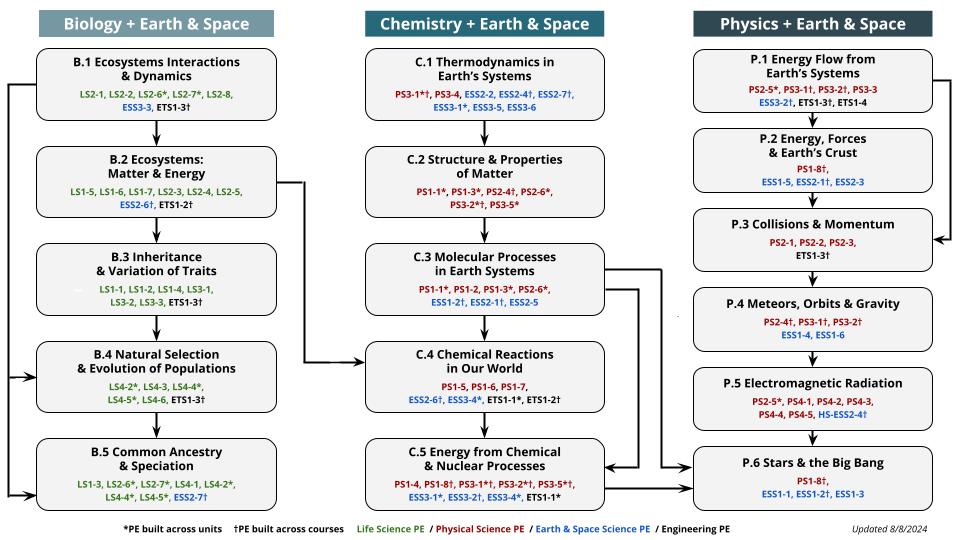 This Scope and Sequence articulates how OpenSciEd’s  programs are organized into bundles of performance expectations (PEs) used to design a target outcome, how the ideas in each unit build on prior learning, and how the three dimensions of the Next Generation Science Standards (NGSS) are reflected in the PE bundles.